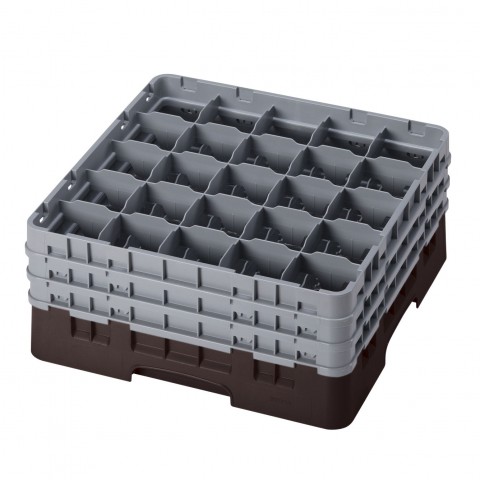 Camrack® Glass Rack, with (3) soft gray extenders, full size, low profile, 19-3/4" x 19-3/4" x 8-7/8", (25) compartments, 3-7/16" max. dia., 7-3/4" max. height, brown, HACCP compliant, NSF