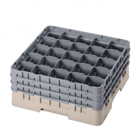 Camrack® Glass Rack, with (3) soft gray extenders, full size, low profile, 19-3/4" x 19-3/4" x 8-7/8", (25) compartments, 3-7/16" max. dia., 7-3/4" max. height, beige, HACCP compliant, NSF
