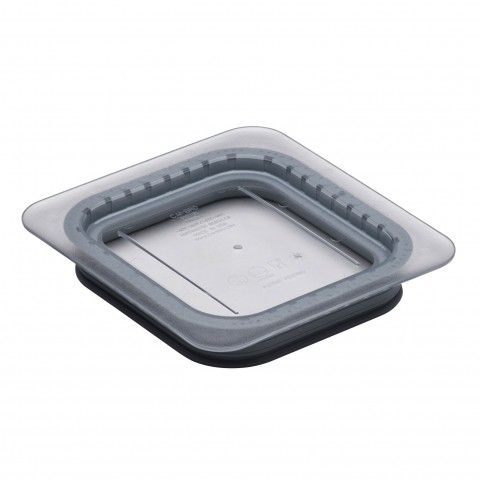 Camwear® GripLid®, fits GN 1/6 size food pan, 6-3/8" x 6-15/16", corner lift, dishwasher safe, stackable, molded in polyurethane gasket, polycarbonate, clear, FDA approved materials, NSF