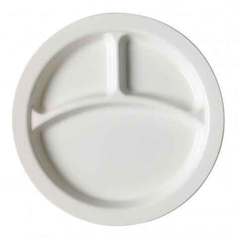 Camwear® Plate, 9" dia., 3-compartment, narrow rim, non-porous surface, smooth glossy finish, scratch resistant, textured surface, polycarbonate, white, NSF
