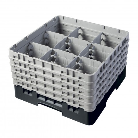 Camrack® Glass Rack, with (5) soft gray extenders, full size, 19-3/4" x 19-3/4" x 12-1/8", (9) compartments, 5-7/8" max. dia., 10-1/8" max. height, black, HACCP compliant, NSF, Made in USA