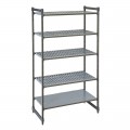 Camshelving® Basics Plus Starter Unit, 24"W x 30"L x 84"H, 5-tier, withstands temperature from -36°F (-38°C) to 190°F (88°C), includes: (4) vented and (1) solid polypropylene shelf plates with Camguard® antimicrobial protection, (4) composite posts with leveling feet installed, pre-assembled post connectors & wedges, (10) traverses & (5) bags of 8 dovetails (4 each A & B), 600 lbs. capacity per shelf (400 lbs. top shelf) /1,800 lbs. max capacity, brushed graphite, NSF