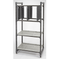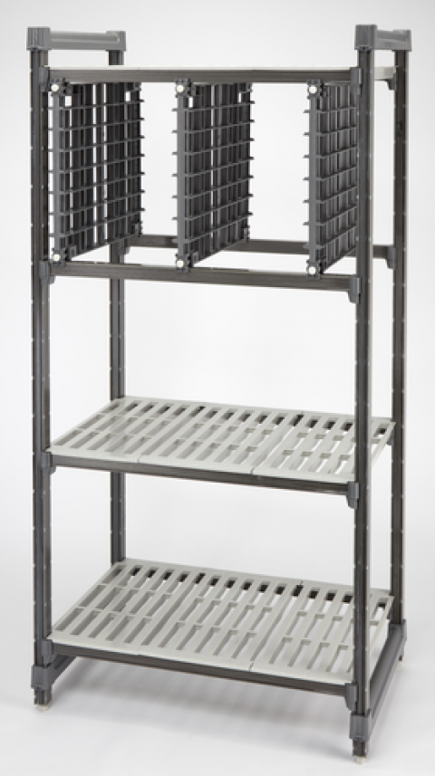 Camshelving® Storage Rack, 24-1/8"D x 19-1/2"H, fits 24" deep shelving, fits Basics® Plus Series, accommodates (4) full-size 4" pans, (2) 6" deep boxes , (7) 18" x 26" pans OR (4) 3" deep pizza dough boxes, add-on kit includes: (1) rail panels, (4) panel bracket sets, (4) traverse brackets & (4) thumbscrews, brushed graphite, NSF, Made in USA