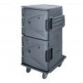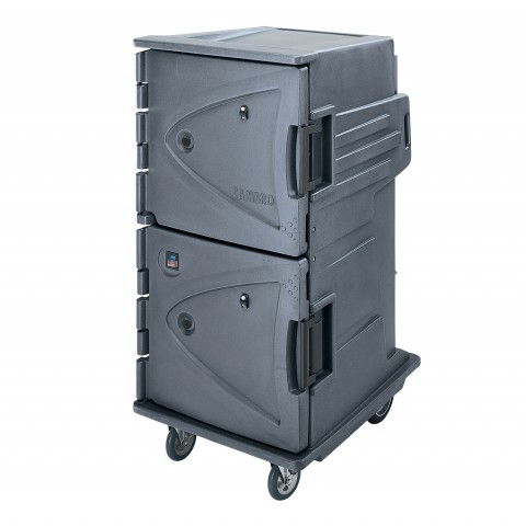 Camtherm® Hot/Cold Cart, 30-1/2"W x 39"D x 64-3/8"H, electric, tall profile, double door, (12) 18" x 26" sheet pans (requires five additional rail sets), (24) 12" x 20" x 2-1/2" deep food pans, (16) 12" x 20" 4" deep food pans, (12) 12" x 20" x 6" deep food pans, (8) 12" x 20" x 8" deep food pans, temperature control dial, on-off power switch, adjustable chrome plated steel slide rails, Celsius solar digital thermometer, molded-in handles & bumpers, serving top, menu clip, (2) 6" front swivel casters with brakes & (2) 10" rear casters, 9' cord with plug, polyethylene exterior, granite gray, 110v/50/60/1-ph, 1570 watts, 14.3 amps, NEMA 5-15P, NSF, ENERGY STAR 0174, cETLus
