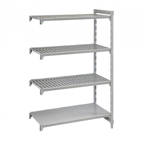 Camshelving® Premium Add-On Unit, 18"W x 54"L x 72"H, 4-tier, withstands temperature from -36°F (-38°C) to 190°F (88°C), includes: (3) vented and (1) solid polypropylene shelf plates with Camguard® antimicrobial protection, (1) pre-assembled post kit (posts constructed of steel with polypropylene exterior), (8) traverses & molded-in dovetails, 800 lbs. capacity per shelf /2,000 lbs. max capacity, speckled gray, NSF