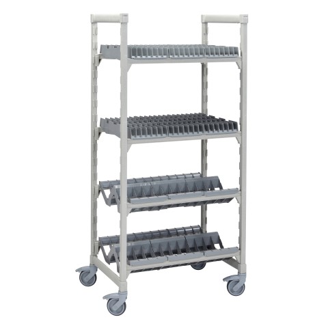 Camshelving® Premium Series Mobile Drying/Storage Rack, 24"W x 36"L x 75-1/4"H, (4) levels: (2) tiers with angled cradles, and (2) tiers with vertical cradles, (2) pre-assembled post sets, (4) premium swivel casters with total locking brake, Camguard® antimicrobial plastic, max. weight bearing 900 lbs., speckled gray, NSF listed components (ships in 6 cartons), Made in USA
