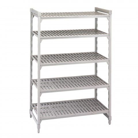 Camshelving® Premium Starter Unit, 24"W x 42"L x 84"H, 5-tier, withstands temperature -36°F (-38°C) to 190°F (88°C), includes: (5) vented polypropylene shelf plates with Camguard® antimicrobial protection, (2) unassembled post kits (posts constructed of steel with polypropylene exterior), (10) traverses & molded-in dovetails, 800 lbs. capacity per shelf /2,000 lbs. max capacity, speckled gray, NSF