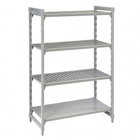 Camshelving® Premium Starter Unit, 24"W x 48"L x 72"H, 4-tier, withstands temperature -36°F (-38°C) to 190°F (88°C), includes: (3) vented and (1) solid polypropylene shelf plates with Camguard® antimicrobial protection, (2) pre-assembled post kits (posts constructed of steel with polypropylene exterior), (8) traverses & molded-in dovetails, 800 lbs. capacity per shelf /2,000 lbs. max capacity, speckled gray, NSF