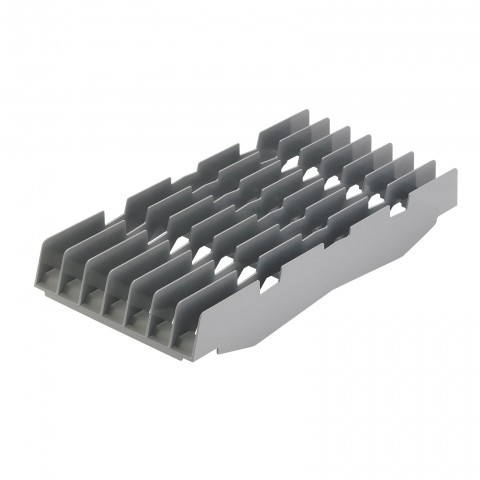 Camshelving® Vertical Drying & Storage Cradle, 10-1/4"W x 23-1/2"L x 3-3/4"H, 7-slot rack, allows sufficient air circulation (maximum product width of 1-5/16"), fits all 24" wide Camshelving®, Camshelving® Elements, Mobile or Stationary up to 24"L to 72"L shelving units, soft gray, high impact ABS, NSF