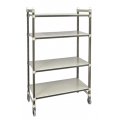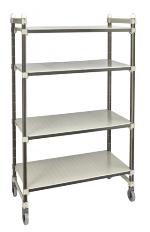 Camshelving® Elements XTRA Series High Density Top Rail Mobile Starter Unit, 18"D x 36"L x 80"H, 4 tier, withstands temperature -36°F (-38°C) to 190°F (88°C), includes: (4) (solid) polypropylene shelves with molded-in Camguard® antimicrobial protection, (2) pre-assembled High Density Top Rail mobile post kits, (4) each Smooth Glide Rollers, (8) High Density Top Rail mobile traverses with wrap around end pieces, (4) bags of 4 dovetails (2 left, 2 right per bag), (4) High Density Top Rail low friction plastic casters. 900 lbs. max unit weight bearing capacity, speckled gray. Made in USA. NSF. NOTE: Elements XTRA High Density Top Rail Mobile Units are NOT interchangeable with Elements XTRA High Density Floor Track Mobile Units.