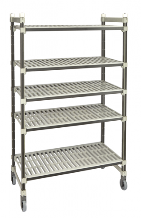 Camshelving® Elements XTRA Series High Density Top Rail Mobile Starter Unit, 18"D x 42"L x 80”H, 4 tier, withstands temperature -36°F (-38°C) to 190°F (88°C), includes: (5) (vented) polypropylene shelves with molded-in Camguard® antimicrobial protection, (2) pre-assembled High Density Top Rail mobile post kits, (4) each Smooth Glide Rollers, (10) High Density Top Rail mobile traverses with wrap around end pieces, (5) bags of 4 dovetails (2 left, 2 right per bag), (4) High Density Top Rail low friction plastic casters. 900 lbs. max unit weight bearing capacity, speckled gray. Made in USA. NSF. NOTE: Elements XTRA High Density Top Rail Mobile Units are NOT interchangeable with Elements XTRA High Density Floor Track Mobile Units.