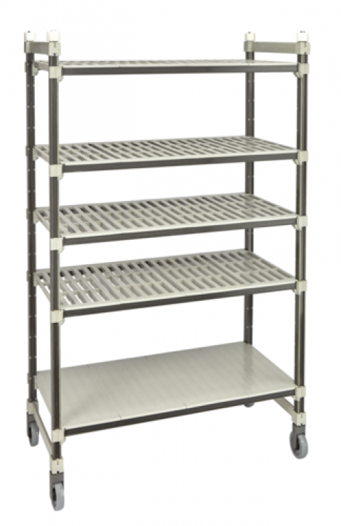 Camshelving® Elements XTRA Series High Density Top Rail Mobile Starter Unit, 21”D x 42"L x 80”H, 4 tier, withstands temperature -36°F (-38°C) to 190°F (88°C), includes: (4) (vented) & (1) (solid) polypropylene shelves with molded-in Camguard® antimicrobial protection, (2) pre-assembled High Density Top Rail mobile post kits, (4) each Smooth Glide Rollers, (10) High Density Top Rail mobile traverses with wrap around end pieces, (5) bags of 4 dovetails (2 left, 2 right per bag), (4) High Density Top Rail low friction plastic casters. 900 lbs. max unit weight bearing capacity, speckled gray. Made in USA. NSF. NOTE: Elements XTRA High Density Top Rail Mobile Units are NOT interchangeable with Elements XTRA High Density Floor Track Mobile Units.