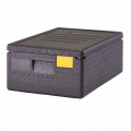 Cam GoBox® Insulated Food Pan Carrier, 28.5 qt., top load, holds (1) GN 1/1 food pan up to 4" deep, ergonomic handles, maintains safe temperature for hot or cold holding for up to 4 hours, dishwasher safe, drip resistant, stackable, lightweight, impact resistant, eco-friendly, 100% recyclable, EPP (expanded polypropylene foam), black