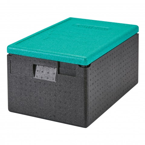 Cam GoBox® Insulated Food Pan Carrier, 48.6 qt., top load, holds (1) GN 1/1 or (2) GN 1/2 sized food pans up to 8" deep, ergonomic handles, maintains safe temperature for hot or cold holding for up to 4 hours, dishwasher safe, drip resistant, stackable, lightweight, impact resistant, eco-friendly, 100% recyclable, EPP (expanded polypropylene foam), black with green lid (shrink wrapped)