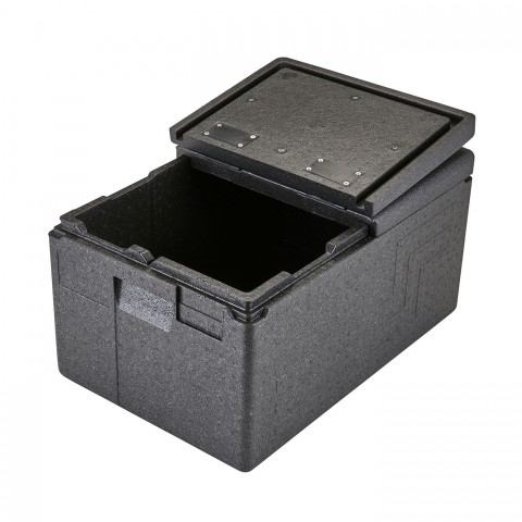 Cam GoBox® Insulated Food Pan Carrier, 48.6 qt., top load, holds (1) GN 1/1 or (2) GN 1/2 sized food pans up to 8" deep, ergonomic handles, maintains safe temperature for hot or cold holding for up to 4 hours, dishwasher safe, drip resistant, stackable, lightweight, impact resistant, eco-friendly, 100% recyclable, EPP (expanded polypropylene foam), black with black flip lid (shrink wrapped) (no broken cartons allowed)