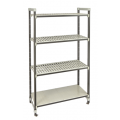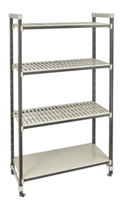 Camshelving® Elements XTRA Series High Density Top Rail Stationary Starter Unit, 18"D x 60"L x 81”H, 4 tier, withstands temperature -36°F (-38°C) to 190°F (88°C), includes: (3) (vented) & (1) solid polypropylene shelves with molded in Camguard® antimicrobial protection, (2) pre-assembled High Density Top Rail stationary post kits, (8) traverses, (4) bags of 4 dovetails (2 left, 2 right per bag), (4) Stainless Steel floor fasteners. 2400 lbs. max unit weight bearing capacity, speckled gray. Made in USA. NSF. NOTE: Elements XTRA High Density Top Rail Stationary Units are NOT interchangeable with Elements XTRA High Density Floor Track Stationary Units.