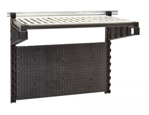 Camshelving® Elevation Series Wall Shelving Task Station Starter Kit, 18" x 36" x 30-1/4", includes: (1) 40" aluminum wall track, (2) 30" wall uprights, (2) 18" deep universal shelf brackets, (1) 18" x 36" vented shelf with CamGuard® antimicrobial shelf plates, (1) 18" x 36" hanging pegboard, black, NSF, Made in USA
