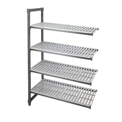 Camshelving® Elements XTRA Stationary Add-On Unit, 18"W x 54"L x 84"H, 4-tier, withstands temperature from -36°F (-38°C) to 190°F (88°C), includes: (4) vented reinforced polypropylene shelf plates with Camguard® antimicrobial protection, (2) composite posts with leveling feet installed, pre-assembled post connectors & wedges, (8) Universal Traverses & (4) bags of 4 dovetails (8 left, 8 right), 800 lbs. capacity per shelf /2,400 lbs. max capacity, speckled gray, NSF (NOTE: This is a new product line. It is NOT compatible with original Elements Series products.)