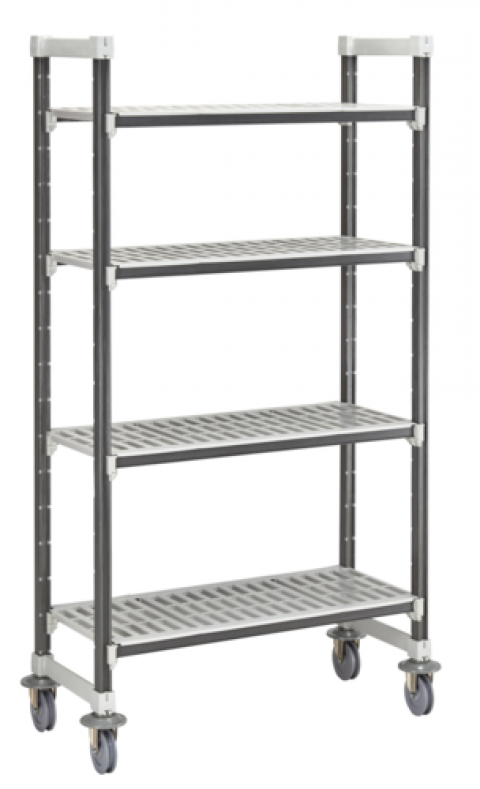 Camshelving® Elements XTRA High Density Mobile Starter Unit, 18"W x 54"L x 70"H, 4-tier, withstands temperature -36°F (-38°C) to 190°F (88°C), includes: (4) (vented) polypropylene shelf plates with Camguard® antimicrobial protection, (2) pre-assembled post kits, (8) universal traverses & (4) bags of 4 dovetails (8 left, 8 right), (4) high density casters & (4) high density bumpers, 900 lbs. max capacity, speckled gray, NSF (NOTE: This is a new product line. It is NOT compatible with original Elements Series products.)