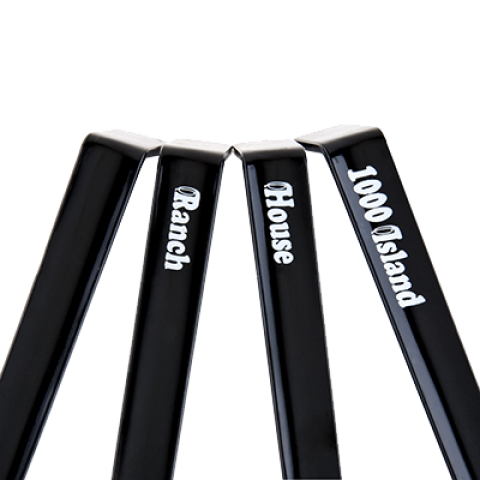 Camwear® Ladle (Assortment Pack), 8-1/2", 3/4 oz., (8) imprinted - thousand island, french, house, italian, bleu cheese, ranch, low calorie and caesar & (4) plain, polycarbonate, black, NSF (priced per piece, packed 12 ladles per pack) (special order, no broken cartons allowed)