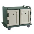 Meal Delivery Cart, 48-1/2"L x 32-1/2"W x 44"H, low profile, single stack rail system, double compartment with self-draining bottom, holds (20) 14" x 18" (35.6 x 45.7 cm ) trays, 5-1/2" (14 cm) clearance between rails, nylon friction latches, non-insulated self venting doors, molded handles on both ends, (4) 5" (12.7 cm) non-marking slightly off-set casters (2 swivel with brakes & 2 rigid), thick foam polyurethane insulation, molded bottom bumpers, polyethylene, granite green, NSF (no assembly required)