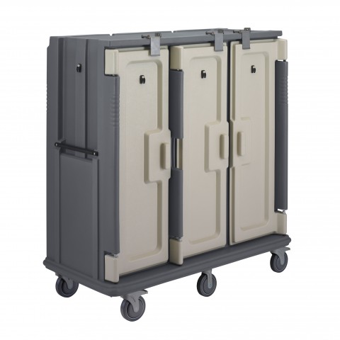 Meal Delivery Cart, tall profile, (3) doors, 3-compartments, holds (30) 14" x 18" trays, 60"W x 29-1/4"D x 63-5/8"H, heavy duty nylon handles, 1 per end, 6" stainless steel casters (2 rigid, 2 swivel with brake, offset), granite gray with cream color door, NSF