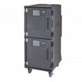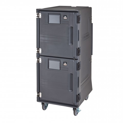 Pro Cart Ultra™ Cold Food Pan Carrier, electric, front loading, holds (16) 18" x 26" sheet pans, (32) 13" x 18" 1/2 size sheet pans, (32) GN 1/1 food pans (2-1/2" deep), (16) 15-3/4" x 23-1/2" trays, (16) 16" x 16" x 2" pizza boxes, (2) gasket free magnetic quick-close doors, 4" nylon latches, menu pocket, 5 pairs of stainless steel Universal rails/compartment with 3" - 1-1/2" spacing, solar digital thermometer, molded-in handles, perimeter bumper, (4) 6" x 2" heavy duty casters (2 fixed, 2 swivel with brakes), polyethylene exterior, charcoal gray, 110V/50/60/1-ph, 326.6 watts, 3.26 amps, cord with NEMA 5-15P, cETLus, NSF, Made in USA