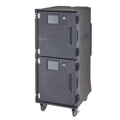 Pro Cart Ultra™ Hot Food Pan Carrier, electric, front loading, holds (16) 18" x 26" sheet pans, (32) 13" x 18" 1/2 size sheet pans, (32) GN 1/1 food pans (2-1/2" deep) (2-1/2" deep), (16) 15-3/4" x 23-1/2" trays, and (16) 16" x 16" x 2" pizza boxes, (2) gasket free magnetic quick-close doors, 4" nylon latches, menu pocket, 5 pairs of stainless steel Universal rails/compartment with 3" - 1-1/2" spacing, solar digital thermometer, molded-in handles, perimeter bumper, 9' cord with plug, (4) 6" x 2" heavy duty casters (2 fixed, 2 swivel with brakes), polyethylene exterior, charcoal gray, 110v/50/60/1-ph, 529 watts, 4.6 amps, NEMA 5-15P, cETLus, NSF, Made in USA