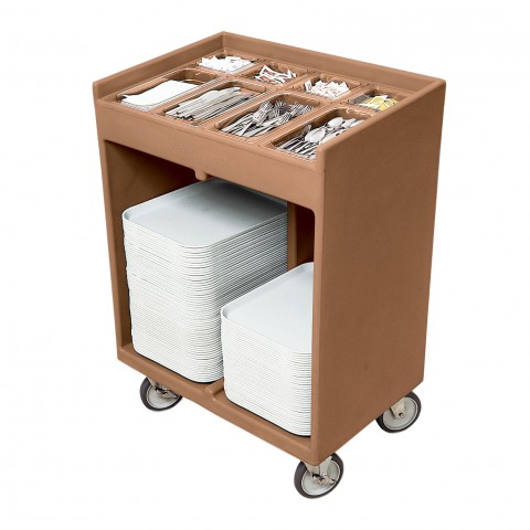 Tray & Silver Cart, 32-3/8"L x 21-1/4"W x 45-1/2"H, with pans & vinyl cover, (8) top compartments hold flatware, napkins & condiments, (4) 6" swivel casters, 2 with brake, polyethylene, coffee beige, NSF
