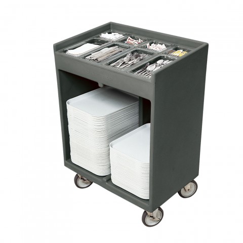 Tray & Silver Cart, 32-3/8"L x 21-1/4"W x 45-1/2"H, with pans & vinyl cover, (8) top compartments hold flatware, napkins & condiments, (4) 6" swivel casters, 2 with brake, polyethylene, granite gray, NSF