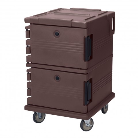 Ultra Camcart® Food Pan Carrier, front loading, one-piece double wall polyethylene shell, foam insulation, holds (16) 2-1/2" deep full size pans, (12) 4" deep full size pans, (8) 6" deep full size pans, (4) 8" deep full size pans, approximate capacity 90 qt., molded-in handles & bumpers, nylon latch, air-tight gasket, vent cap, (4) 6" casters (2 fixed, 2 swivel, 1 with brake), dark brown, NSF, Made in USA