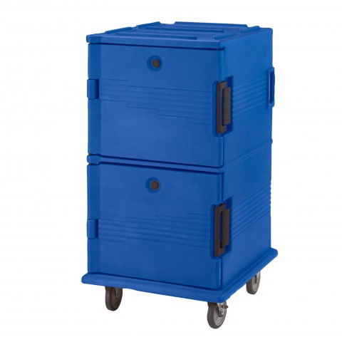 Ultra Camcart® Food Pan Carrier, front loading, one-piece double wall polyethylene shell, foam insulation, holds (24) 2-1/2" deep full size pans, (16) 4" deep full size pans, (12) 6" deep full size pans, (8) 8" deep full size pans, approximate capacity 120 qt., security package, tamper resistant, molded-in handles & bumpers, nylon latch, air-tight gasket, vent cap, (4) heavy duty 6" casters (2 fixed, 2 swivel with brakes), navy blue, NSF, Made in USA
