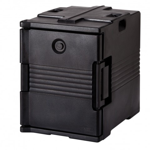 Ultra Pan Carrier®, front loading, one-piece poly shell, foam insulation, holds 1/2, 1/3 & full size pans 2-1/2" to 8" deep, approximate capacity 60 qt., molded-in handles, nylon latch, air-tight gasket, vent cap, stackable, dishwasher safe, black, NSF, Made in USA