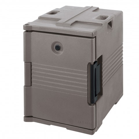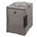 Ultra Pan Carrier®, front loading, one-piece poly shell, foam insulation, holds 1/2, 1/3 & full size pans 2-1/2" to 8" deep, approximate capacity 60 qt., molded-in handles, nylon latch, air-tight gasket, vent cap, stackable, dishwasher safe, granite sand, NSF, Made in USA