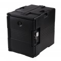 Ultra Pan Carrier®, front loading, one-piece poly shell, foam insulation, holds 1/2, 1/3 & full size pans 2-1/2" to 8" deep, approximate capacity 60 qt., security package, tamper resistant, molded-in handles, nylon latch, air-tight gasket, vent cap, stackable, dishwasher safe, black, NSF, Made in USA