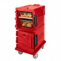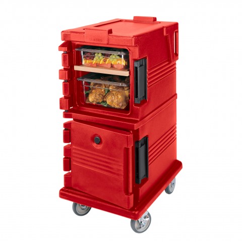 Ultra Camcart® Food Pan Carrier, front loading, one-piece double wall polyethylene shell, foam insulation, holds (8) 2-1/2" deep full size pans, (6) 4" deep full size pans, (4) 6" deep full size pans (2) 8" deep full size pans, approximate capacity 45 qt., molded-in handles & bumpers, nylon latch, air-tight gasket, vent cap, (4) 5" casters (2 fixed, 2 swivel, 1 with brake), hot red, NSF, Made in USA