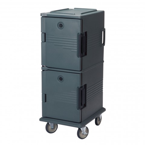 Ultra Camcart® Food Pan Carrier, front loading, one-piece double wall polyethylene shell, foam insulation, holds (12) 2-1/2" deep full size pans, (8) 4" deep full size pans, (6) 6" deep full size pans, (4) 8" deep full size pans, approximate capacity 60 qt., molded-in handles & bumpers, nylon latch, air-tight gasket, vent cap, (4) 6" casters (2 fixed, 2 swivel, 1 with brake), granite gray, NSF, Made in USA