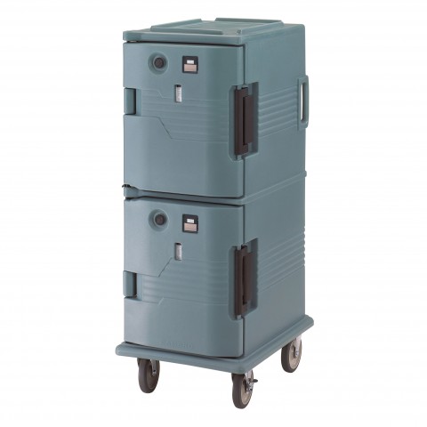 Ultra Camcart® Heated Food Pan Carrier, 20-1⁄2"W x 27-1⁄8"D x 54"H, front loading, one-piece double wall polyethylene shell, polyurethane foam insulated, holds (12) 2-1/2" deep food pans, (8) 4" deep food pans, (6) 6" deep food pans, (4) 8" deep food pans, molded-in handles, nylon latch, vent cap, 9' power cord, (4) 6" casters (2 swivel, 2 fixed, 1 with brake), 110v/50/60/1-ph, 230 watts, 2.0 amps, NEMA 5-15P, slate blue, NSF, ENERGY STAR®, cETLus, CE