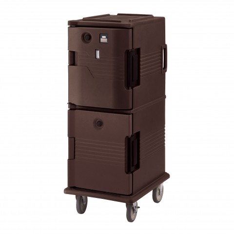 Ultra Camcart® Heated Food Pan Carrier, 20-1⁄2"W x 27-1⁄8"D x 54"H, heated top door only, front loading, one-piece double wall polyethylene shell, polyurethane foam insulated, holds (12) 2-1/2" deep food pans, (8) 4" deep food pans, (6) 6" deep food pans, (4) 8" deep food pans, molded-in handles, nylon latch, vent cap, (4) 6" casters (2 swivel, 2 fixed, 1 with brake), 110v/50/60/1-ph, 230 watts, 2.0 amps, NEMA 5-15P, dark brown, NSF, ENERGY STAR®, cETLus, CE