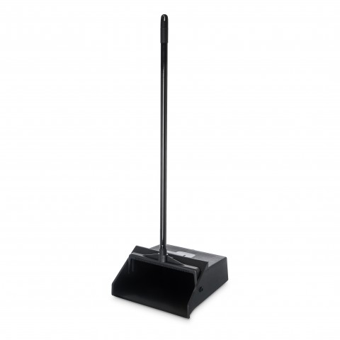 Flo-Pac® Duo-Pan™ Lobby Dust Pan, 12" wide, hanging hole, pivot and lock bucket, metal handle, plastic, black