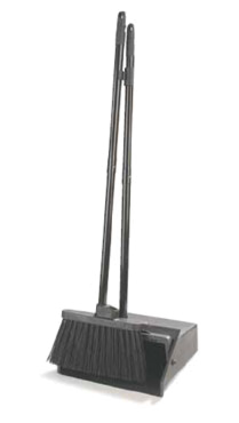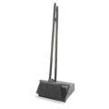 Duo-Pan™ Lobby Pan & Duo-Sweep Broom Combo, 30" two-piece vinyl coated steel handle, broom handle clip, serrated edge along bail, pivoting hanging hole, pivot/lock/release bail pan, plastic, black