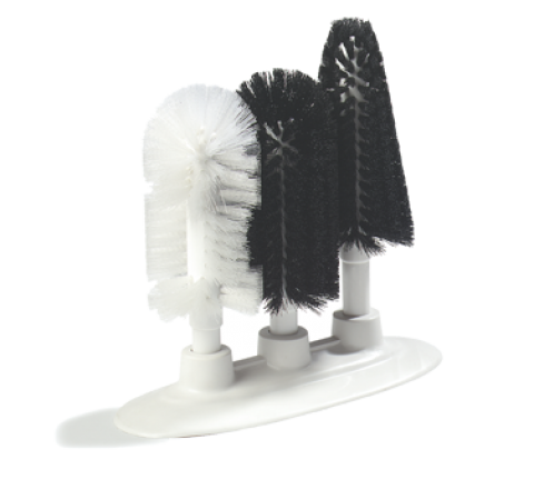 Sparta® Triple Glass Washer, 9-1/2" long, 6-1/4"L x 2-7/8" dia. brush heads, for pilsner, hurricane and standard glasses, heavy-duty stapleset polyester bristles, threaded stems on molded white plastic base with positive suction, (2)-black/(1)-white, BPA Free