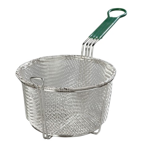 Mesh Fryer Basket, 8-3/4" dia., round, front drain hook, cool-touch handle, dishwasher safe, chrome-plated nickel steel