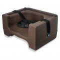 Dual Booster Seat, dual-sided seat for height choice, one-piece molded design, wide square base, adjustable strap, anti-skid pads, stackable, recyclable, brown
