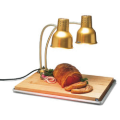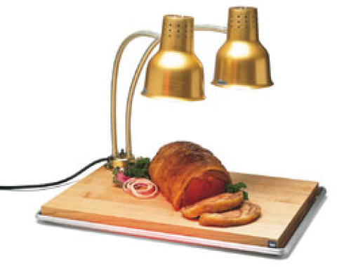 Flexiglow™ Carving Station, countertop, (2) 24" vinyl-coated dual-flex arms, 4" dia. base, (2) flared rim perforated shades, (1) 18" x 26" drip pan and (1) 16" x 24" maple cutting board, (2) 250 watt red bulbs, aluminum, anodized gold finish, 110-120v/60/1-ph, NSF, UL