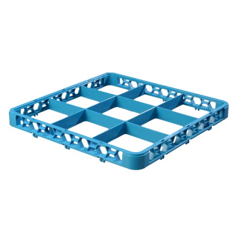 OptiClean™ Divided Glass Rack Extender, full-size, 9-compartments (5-13/16" x 5-13/16"), positive stacking, four-way tracking, double-wall reinforced polypropylene, textured finish, blue, NSF