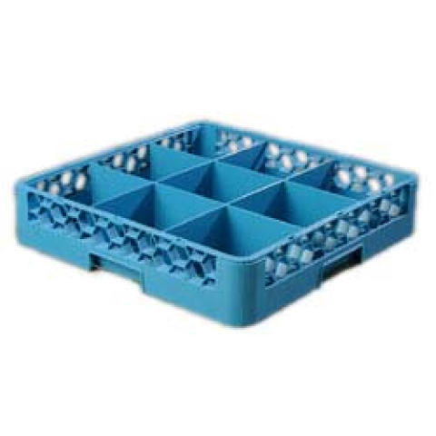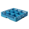 OptiClean™ Dishwasher Glass Rack, 9-compartments (5-13/16" x 5-13/16"), full-size, holds glasses up to 5-9/16" in diameter with inside height of 3-1/4", double-wall construction, quick draining, positive stacking, four-way tracking, comfort curve handles on all 4 sides, polypropylene, textured finish, blue, NSF