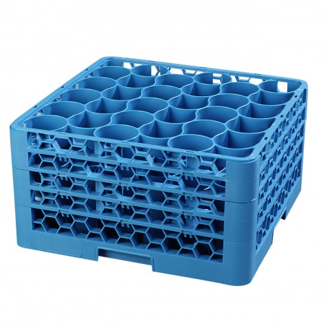 OptiClean™ NeWave™ Dishwasher Glass Rack, 30-rounded compartments with (4) Sure-Lock extenders, full-size, holds glasses up to 2-7/8" in diameter with inside height of 10-1/4", double-wall construction, quick draining, positive stacking, four-way tracking, comfort curve handles on all 4 sides, polypropylene, textured finish, blue, NSF, Made in USA, BPA Free