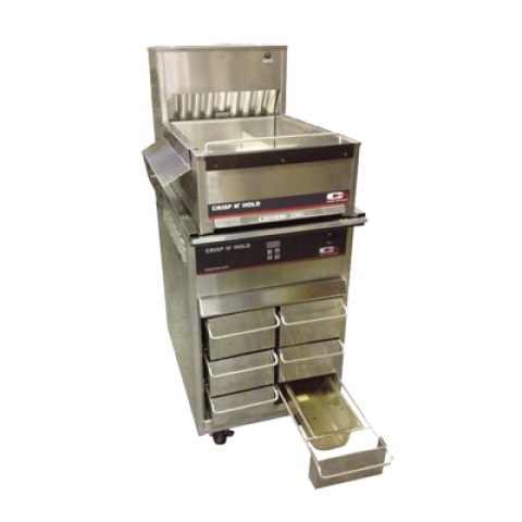 CNH18XD Crisp 'N Hold station stacked on top of VCNH2W3S Vertical Crisp 'N Hold with reinforced top for added food holding capacity. Accessories included: fryer gap cover, false bottom trivet with divider, fry scoop holder, fry bag holder, fry bag ribbon insert. Separate electrical connections for each cabinet. CNH18XD: 120v, 1820 watts, 15.1 amps, NEMA 5-20P, UL, NSF, CE; VCNH2W3S: 120v, 1800 watts, 15.2 amps, NEMA 5-20P, ETL, ETLsan, CE