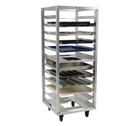 Pan Rack, 64-1/4"H, 24-1/4"W, 26-1/2"D, universal, (12) 18" x 26" trays or (24) 12" x 20" pans at 4-1/2" spacing, slides adjustable at 1-1/2" increments, aluminum construction, end loading, 5" casters